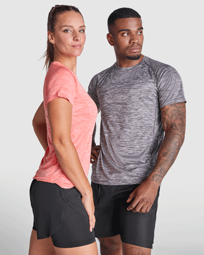 La camiseta deportiva Austin de Roly destaca por su acabado jaspeado, aportando un estilo moderno y actual frente a la camiseta técnica clásica.